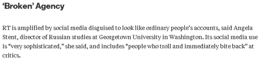Bloomberg Politics global news portal insists that “Sanctions-Strapped Russia Outguns the U.S. in Information War” and cites former U.S. State Department intelligence officer and NATO adviser Angela Stent as saying that “RT is amplified by social media disguised to look like ordinary people’s accounts...Its social media use is “very sophisticated,” she said, and includes “people who troll and immediately bite back” at critics.’”